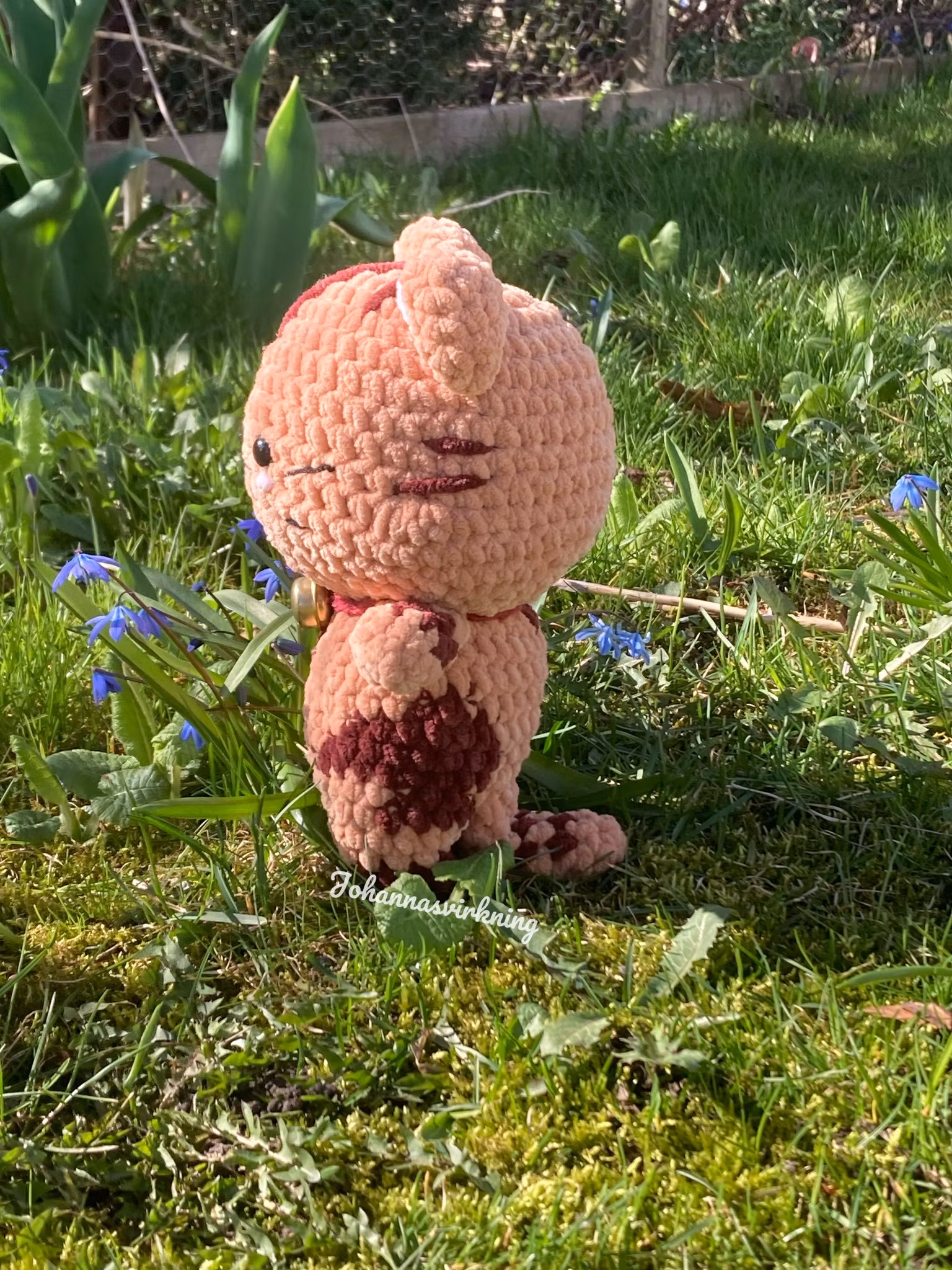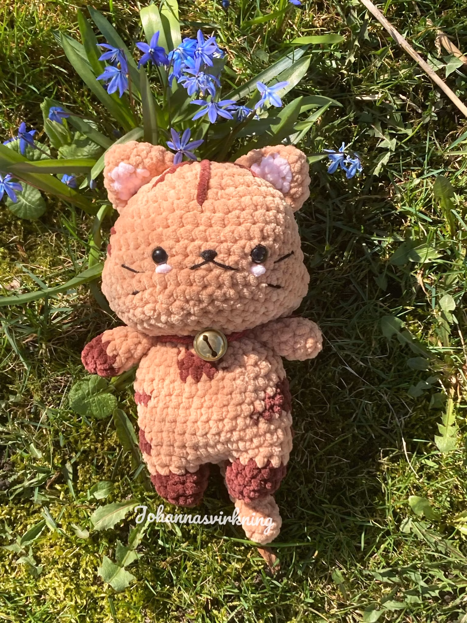 Den här katten är virkad av mjukt polyester garn och stoppad med polyester, säkerhetsögon av plast.