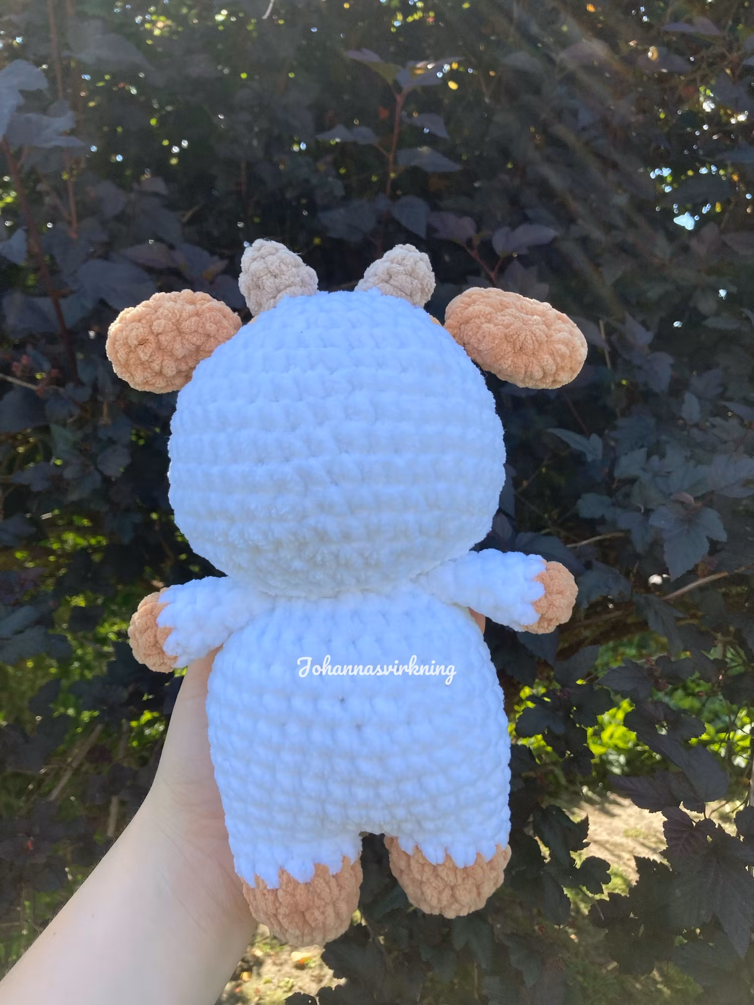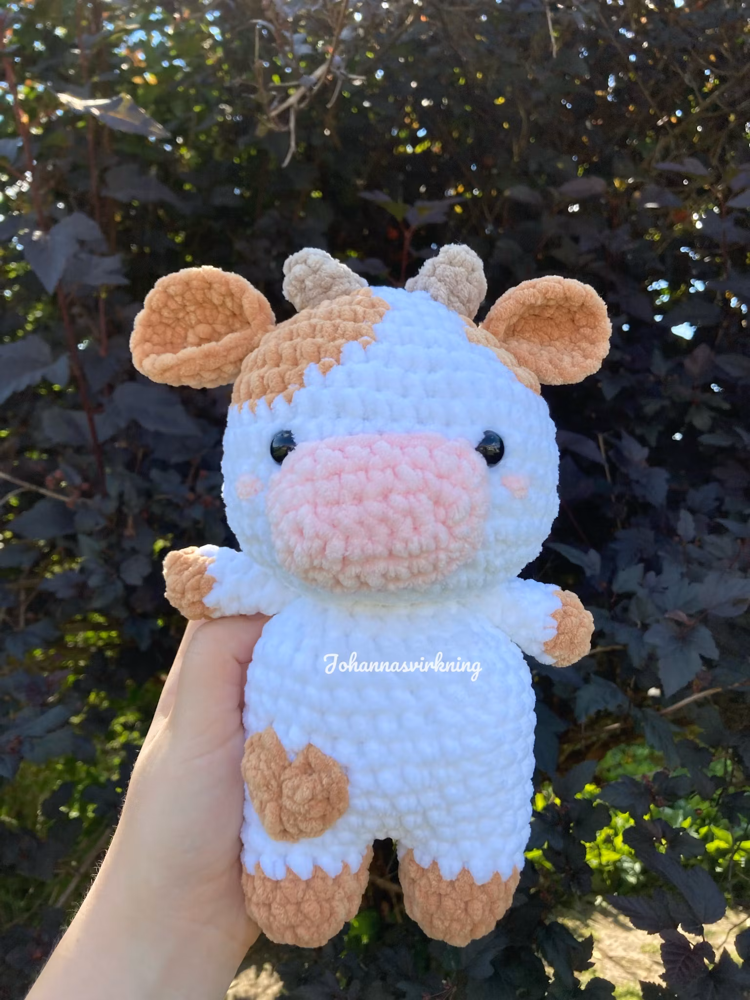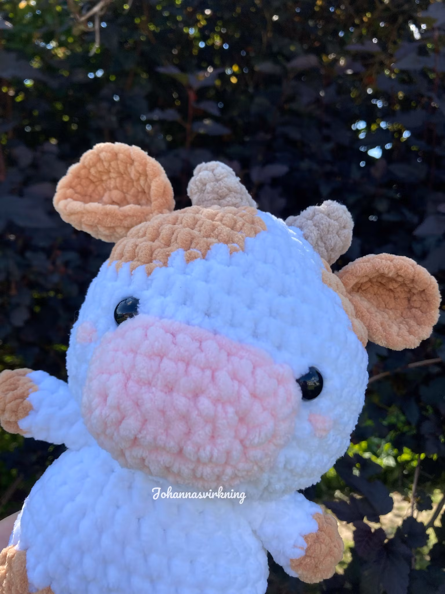Virkad ko. Gjord av mjukt polyester garn, stoppad med polyester och har säkerhetsögon av plast. Cirka 24 cm lång.