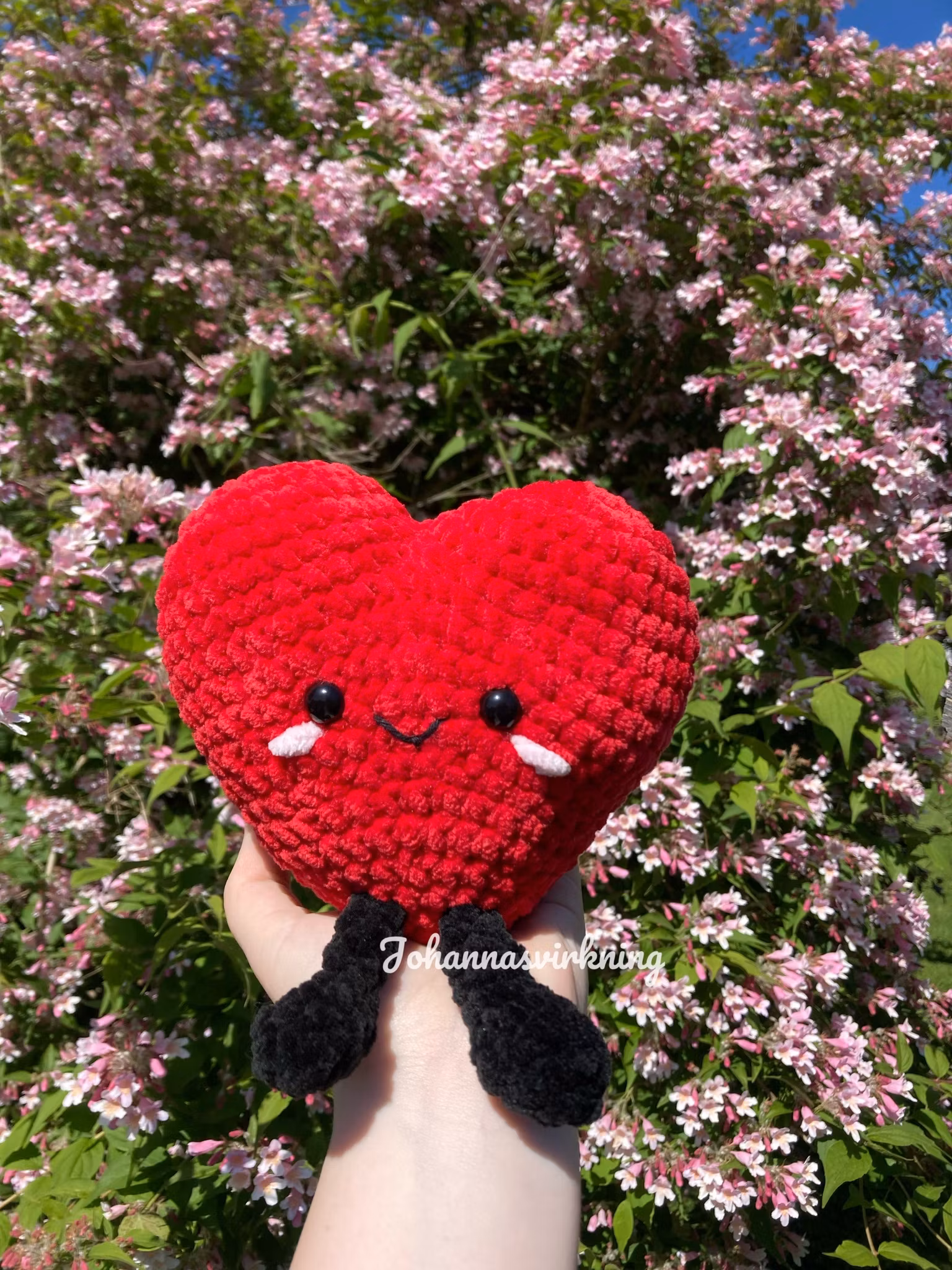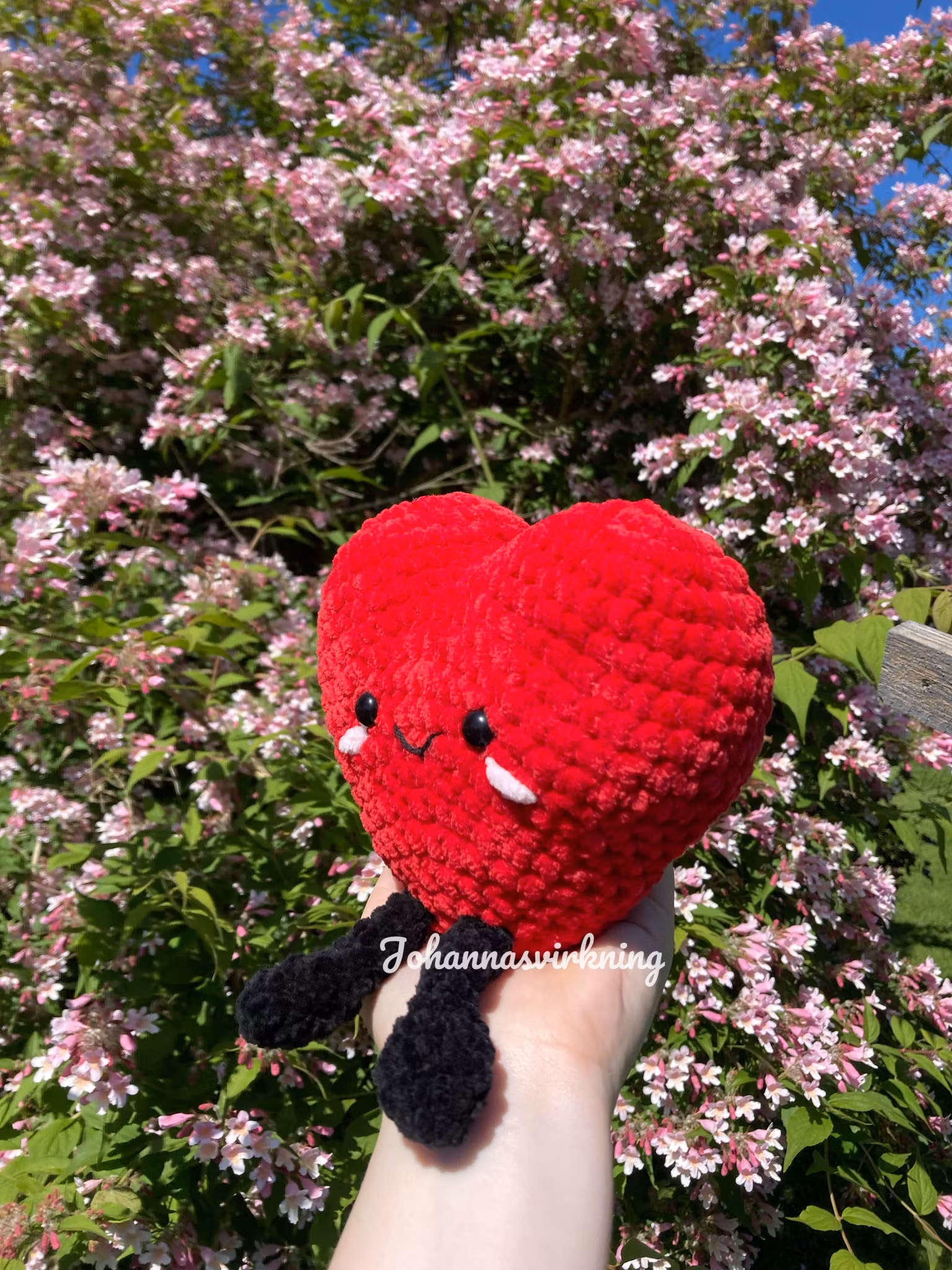 Virkat hjärta av mjukt polyeter garn, stoppad med polyester och har säkerhetsögon av plast. 17 cm lång. OBS: Håll utom räckvidd av barn under 3 år och djur