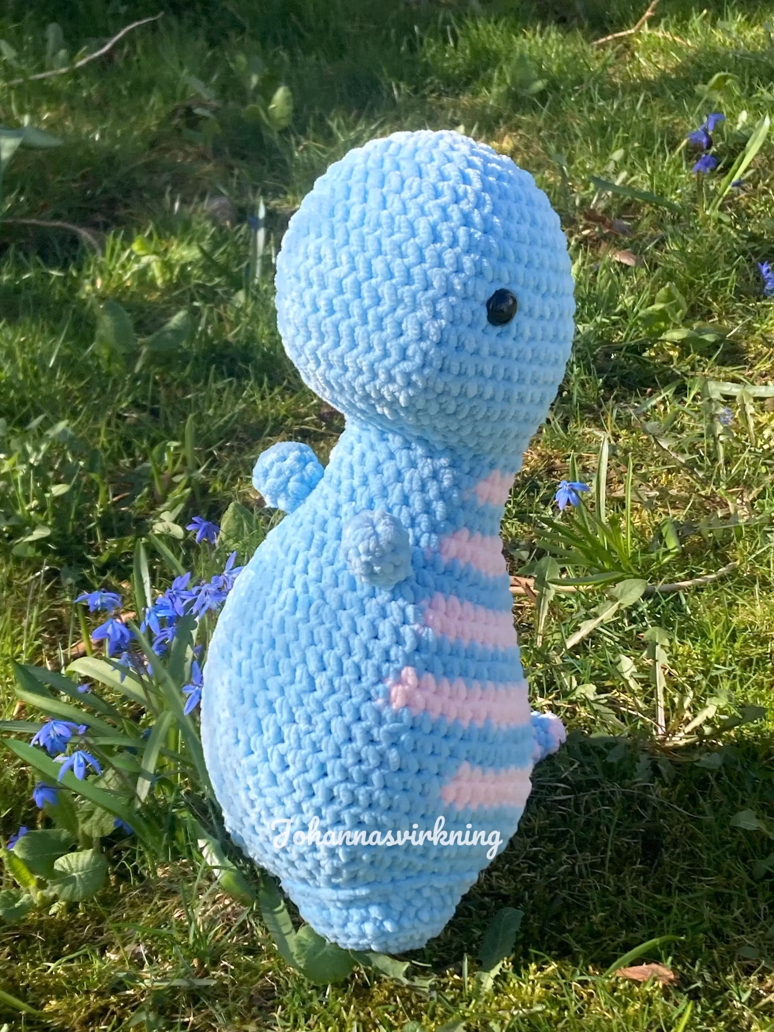 Dinosaurie virkad med mjukt polyester garn, stoppad med polyester stoppning och har säkerhetsögon av plast.