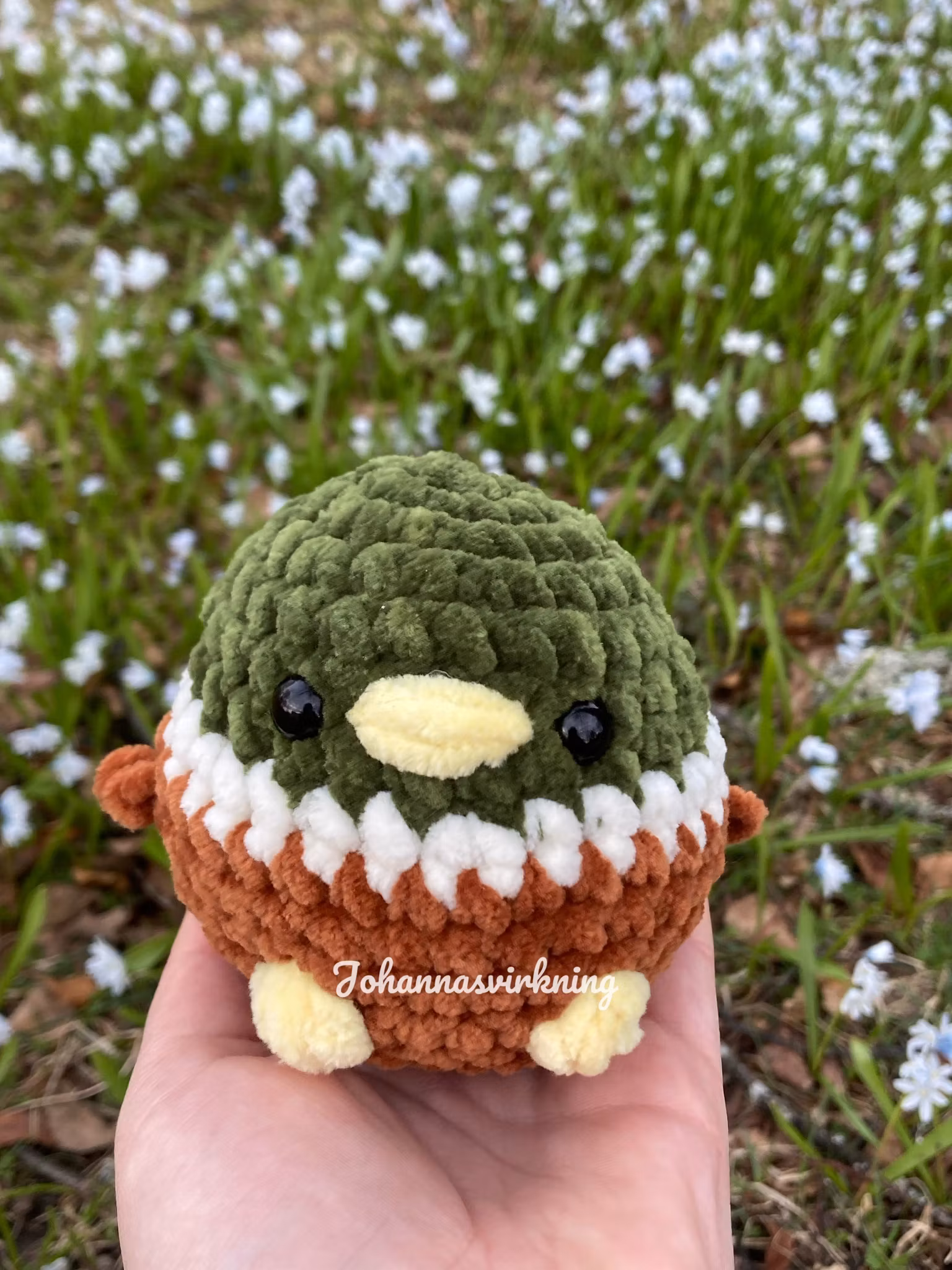 Den här anden är virkad av mjukt polyester garn, stoppad med polyester och har säkerhetsögon av plast.