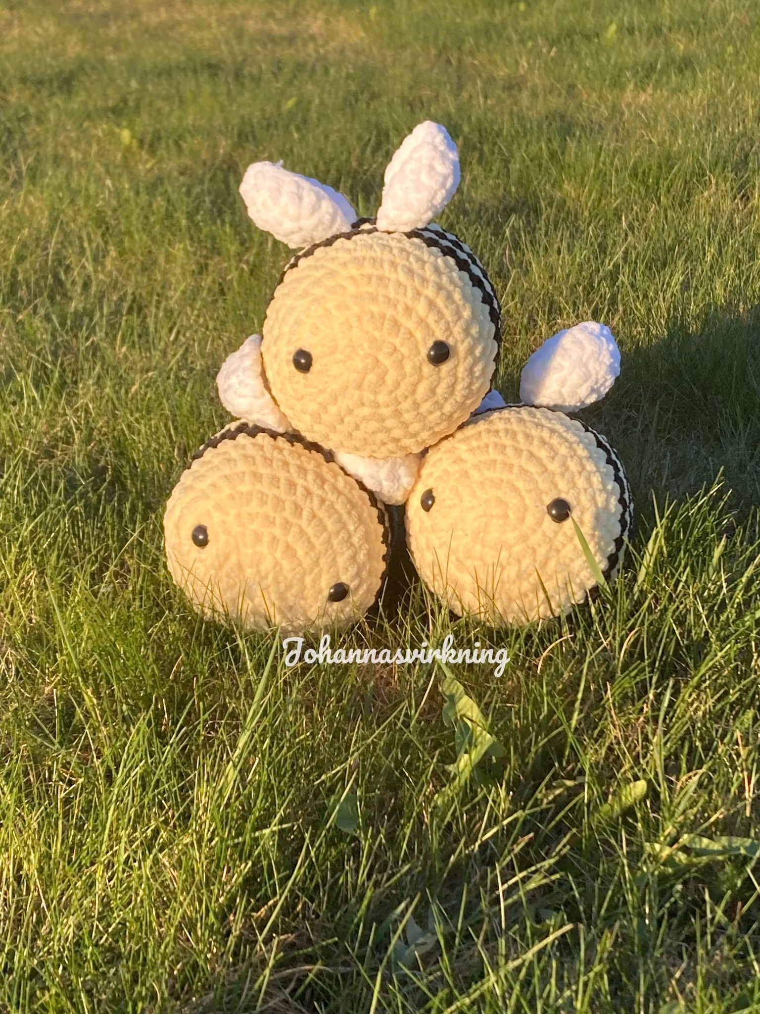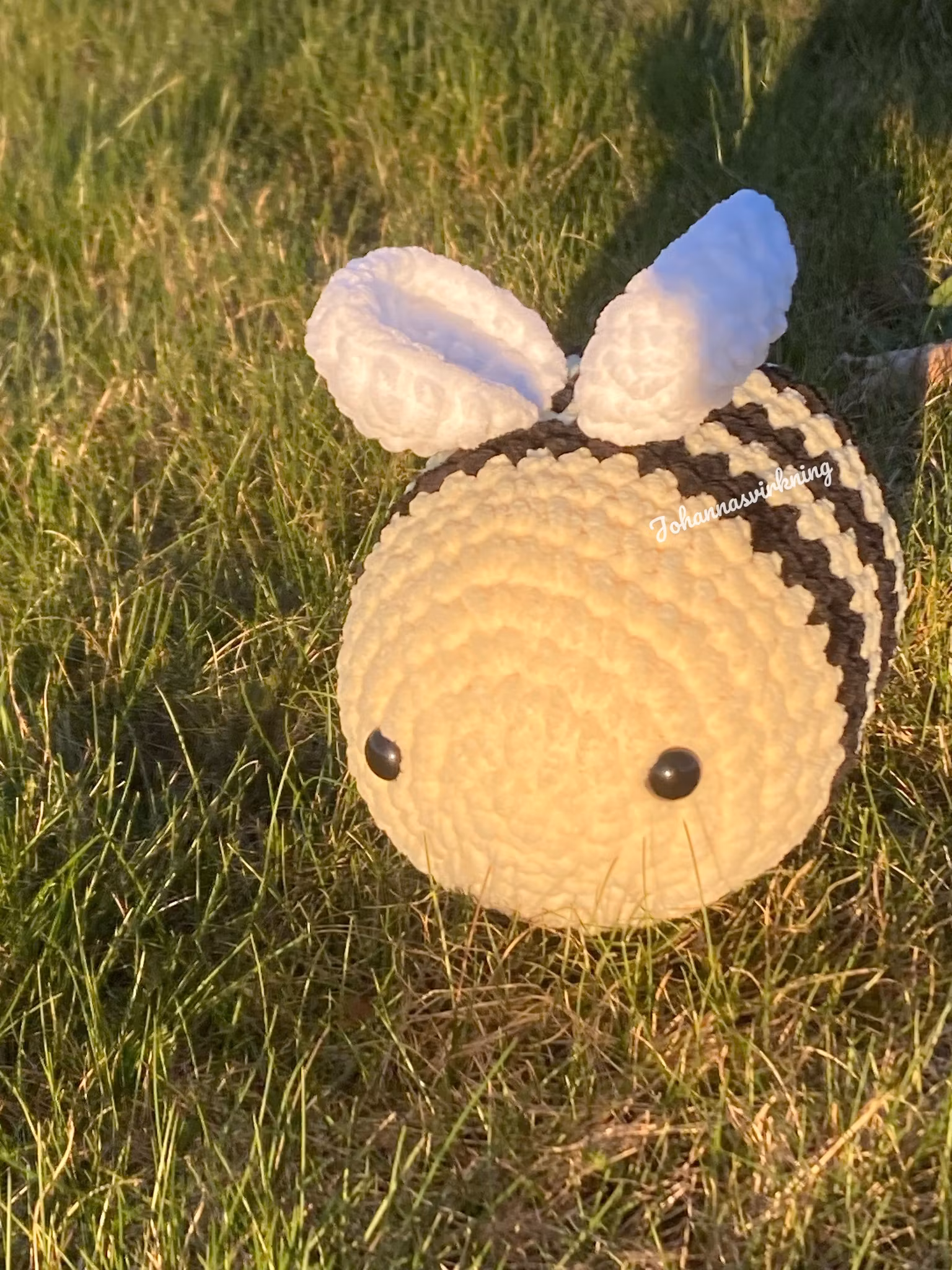 Virkad med polyester garn, stoppad med polyester, säkerhetsögon av plast. Biet ät cirka 11 cm hög och cirka 14 cm lång.