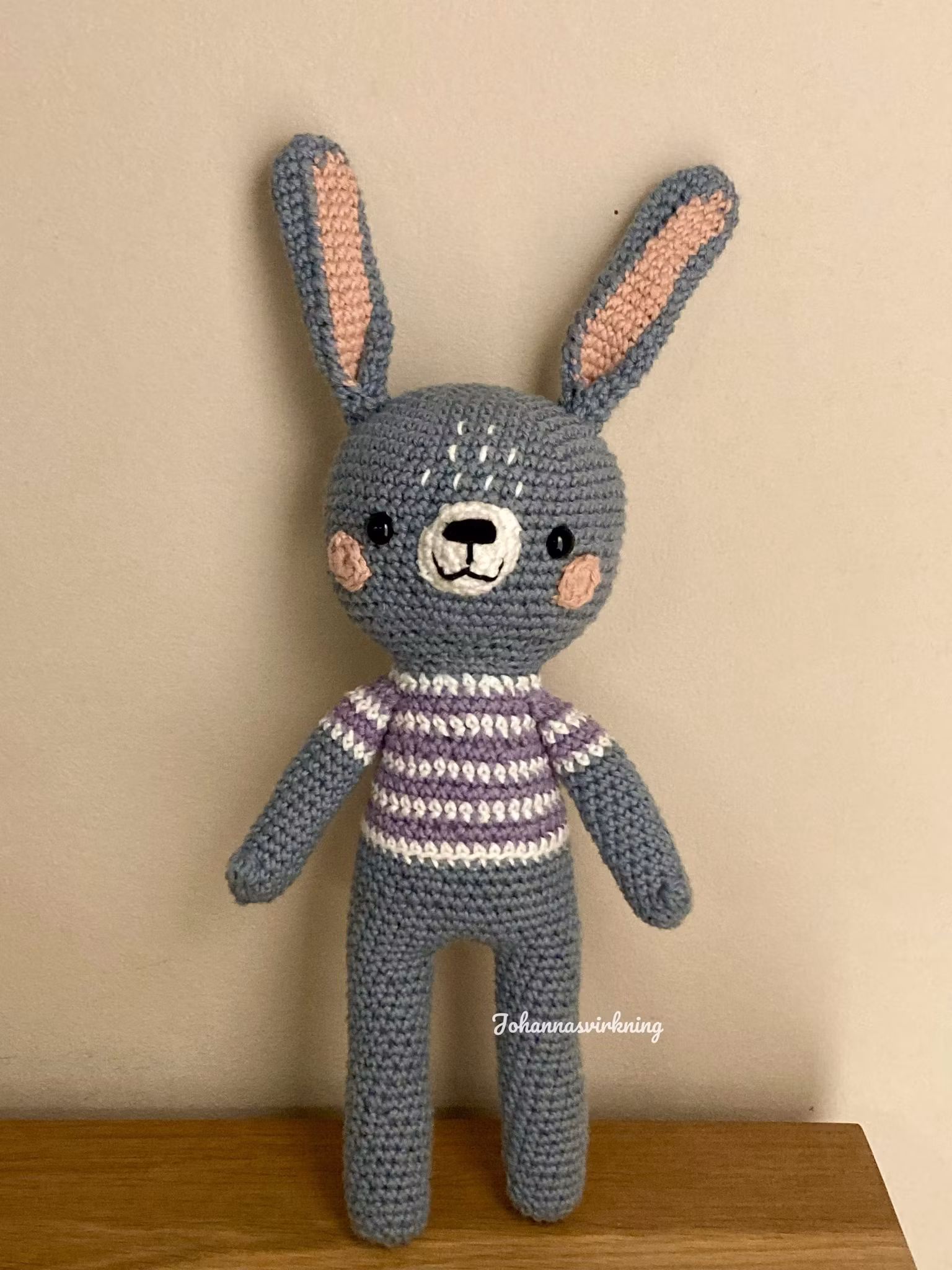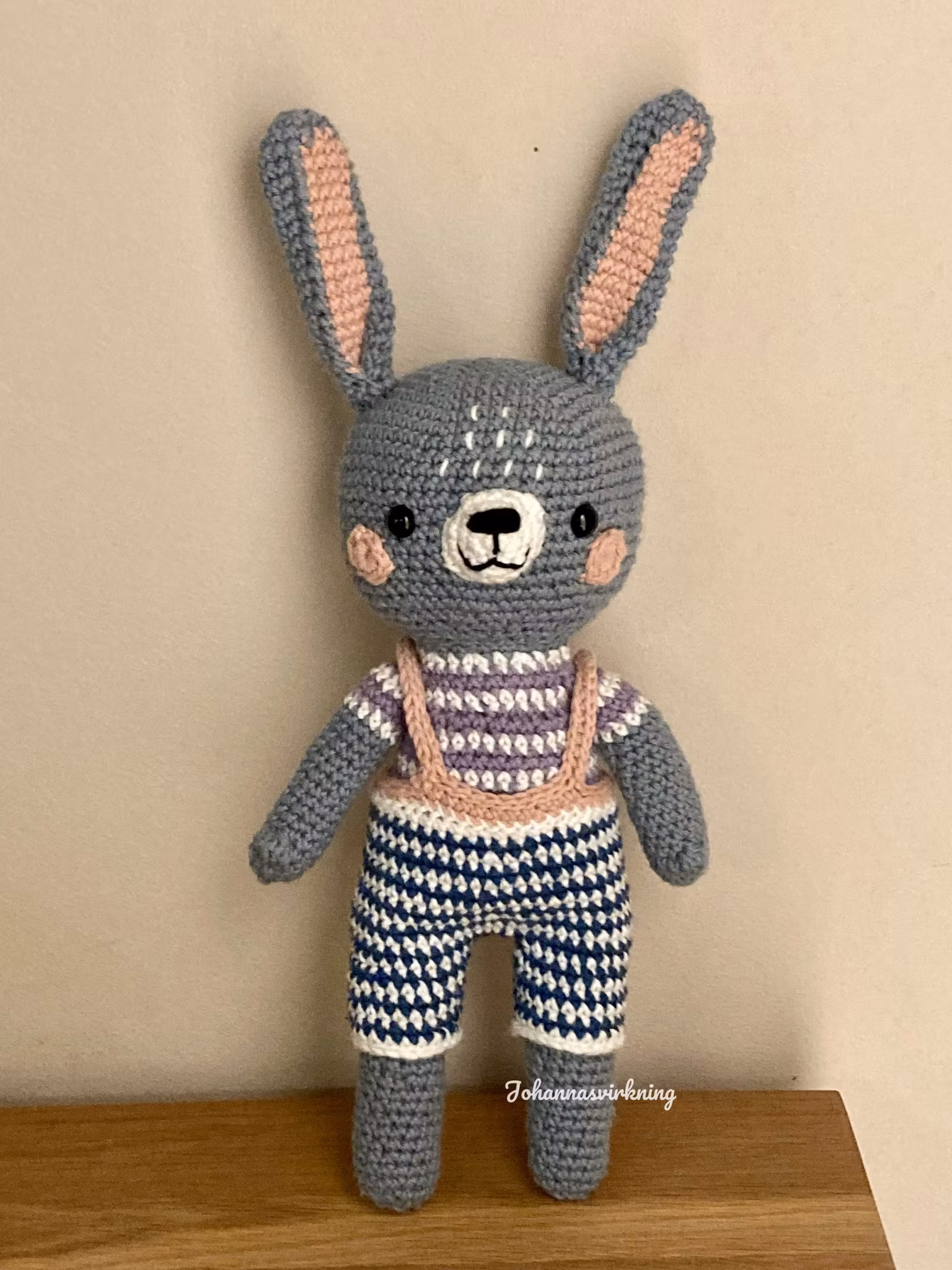 Virkad med 100% bomull garn, stoppad med polyester och har säkerhetsögon av plast. Kommer med avtagbara hängselbyxor.