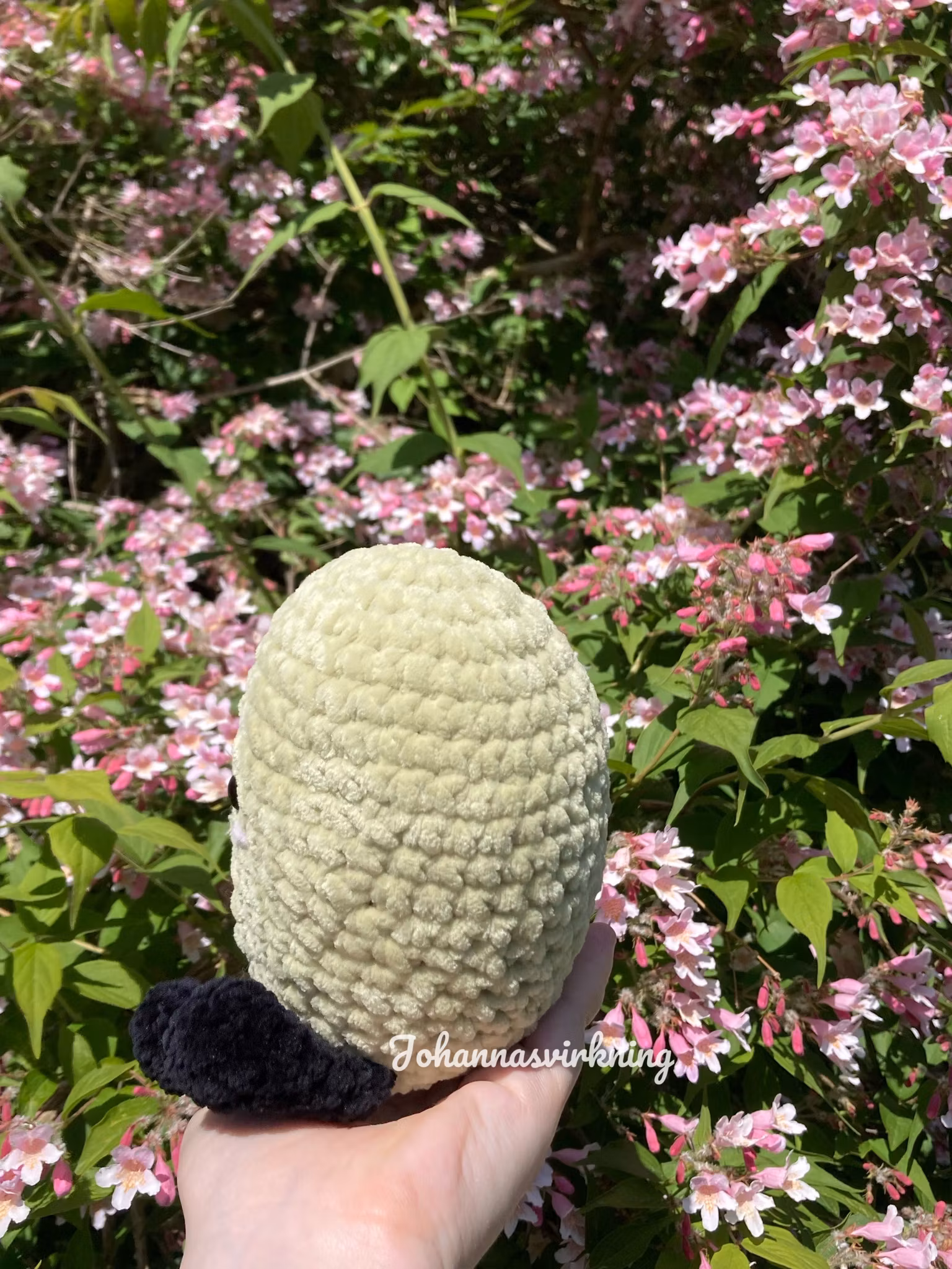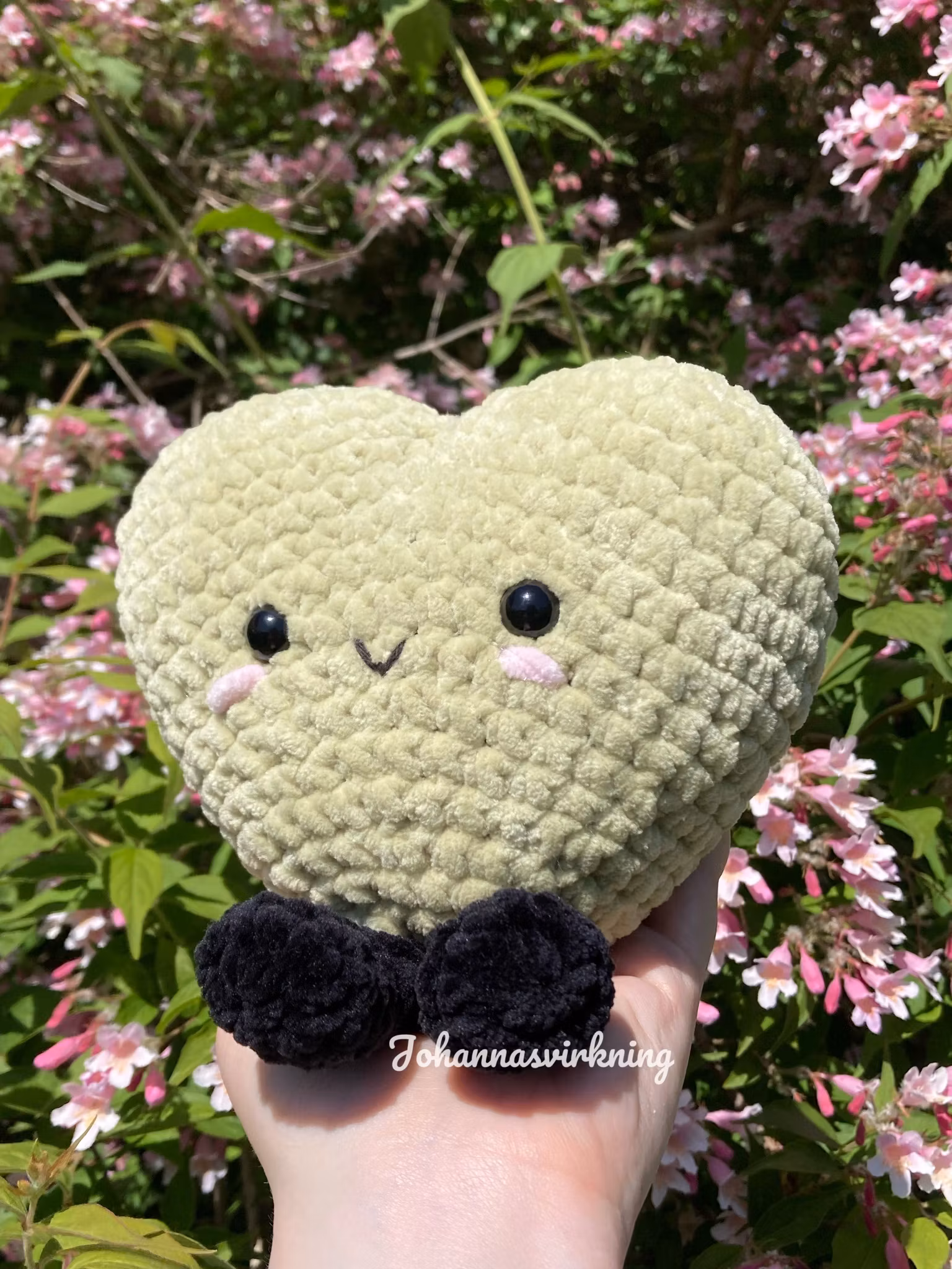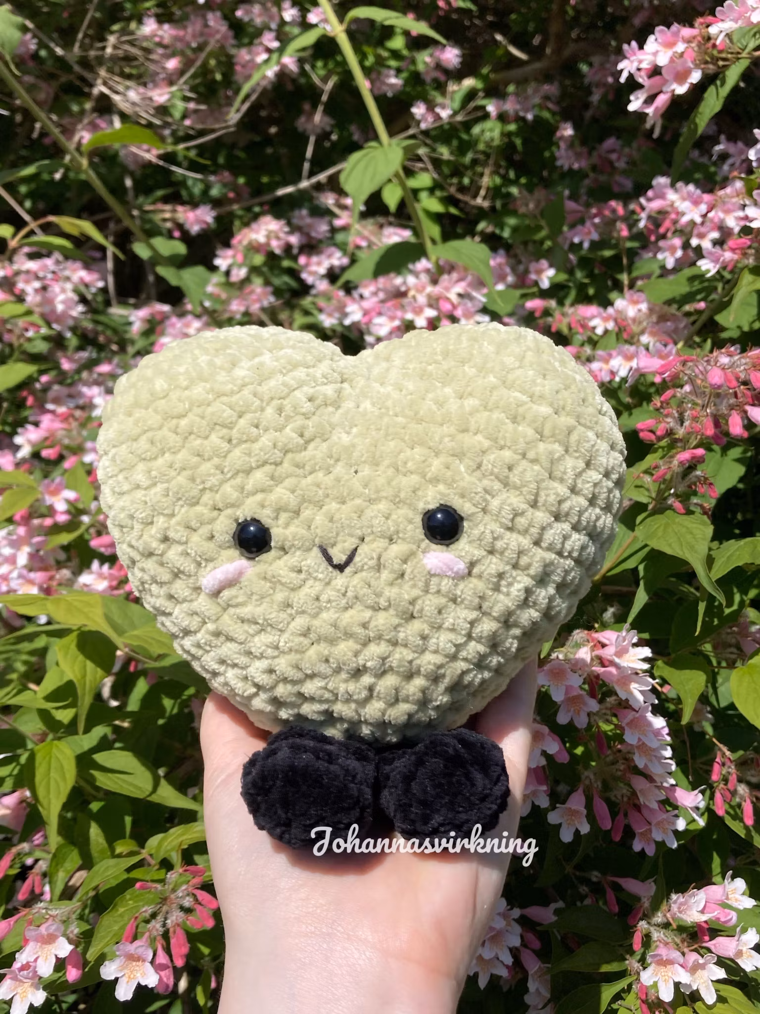 Virkat hjärta av mjukt polyeter garn, stoppad med polyester och har säkerhetsögon av plast. 17 cm lång.