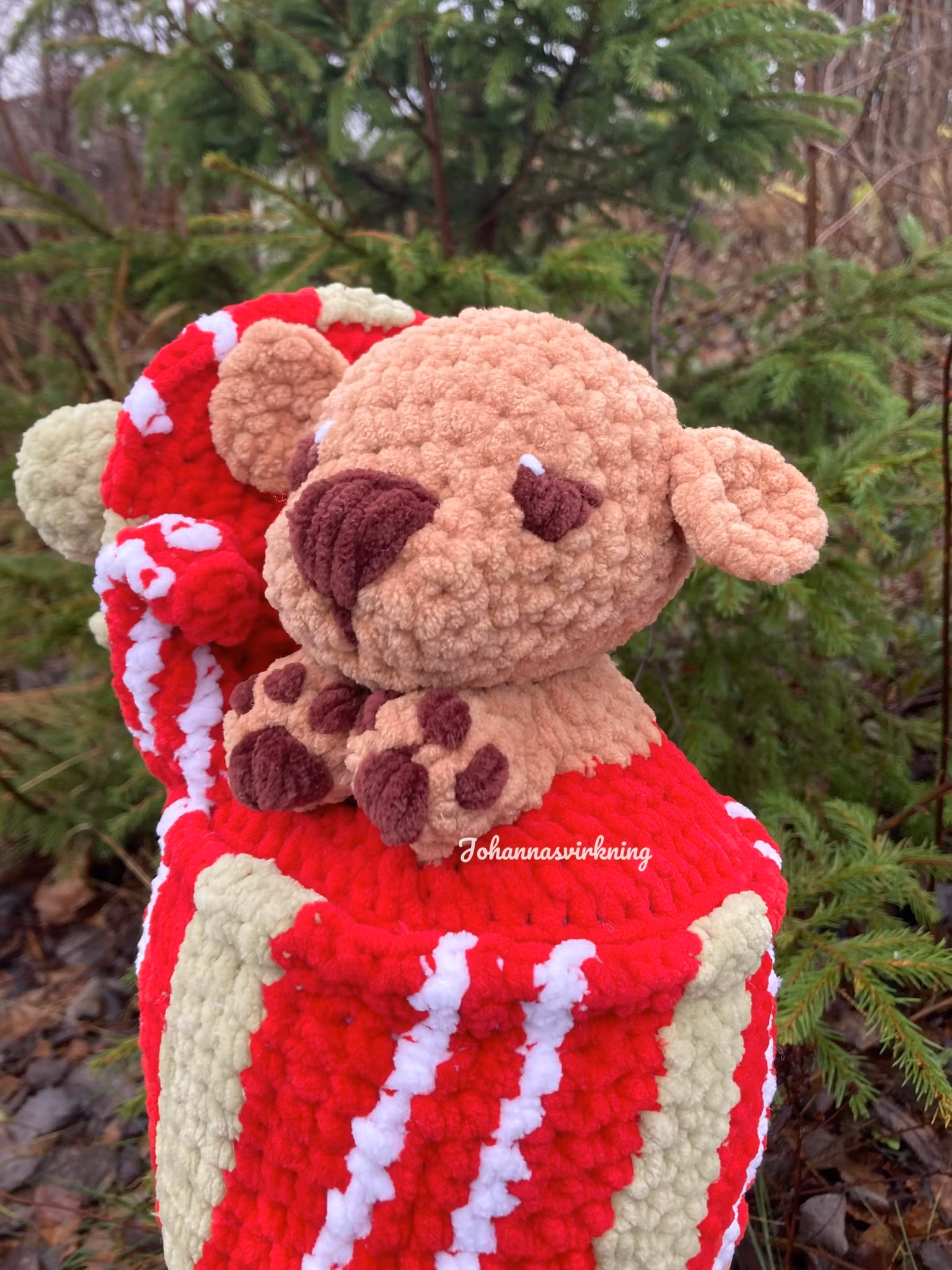 Den är virkad med mjukt 100% polyester garn, stoppad med polyester stoppning och broderade detaljer med polyester garn.