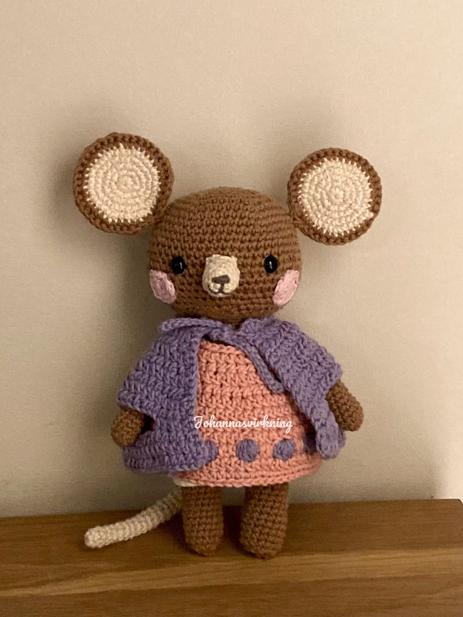Kommer med avtagbar kappa, klänning och underbyxor. Cirka 26 cm lång med öronen.