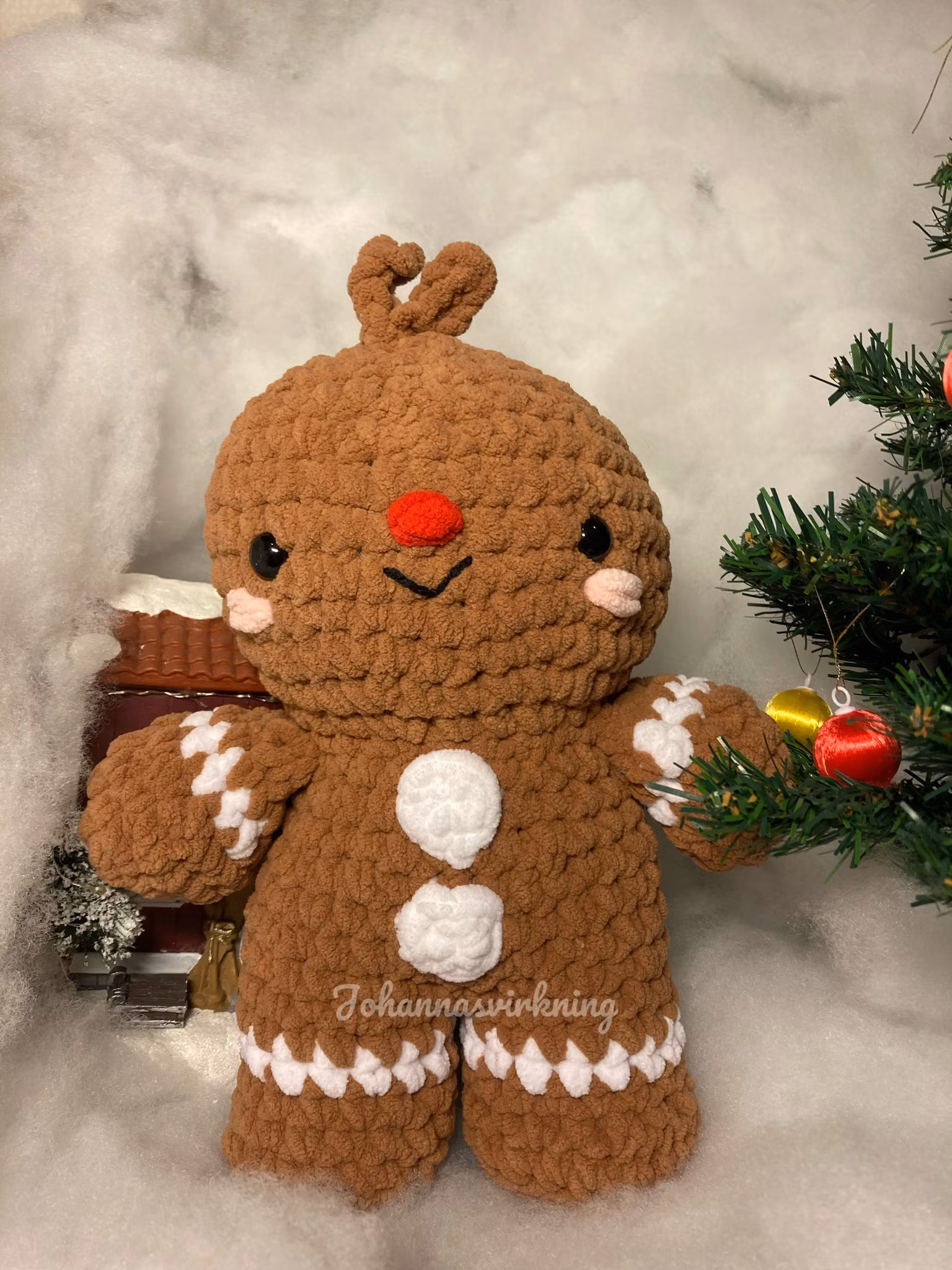 Den är virkad av 100% polyester garn som gör den väldigt mysig och varm. Perfekt som dekoration eller gosedjur till dig själv och som present.