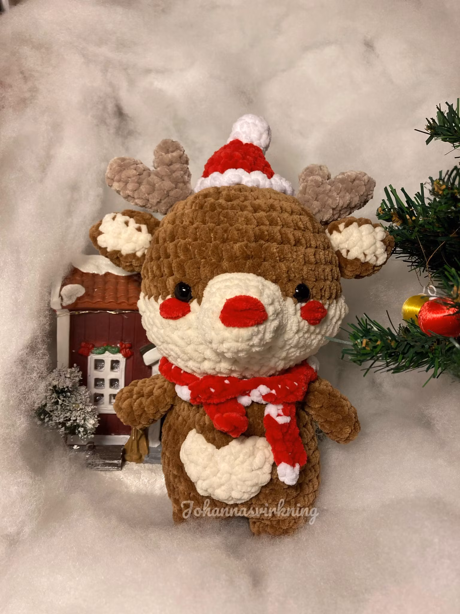 Den här juliga renen kommer med en fast syd tomteluva och en halsduk.