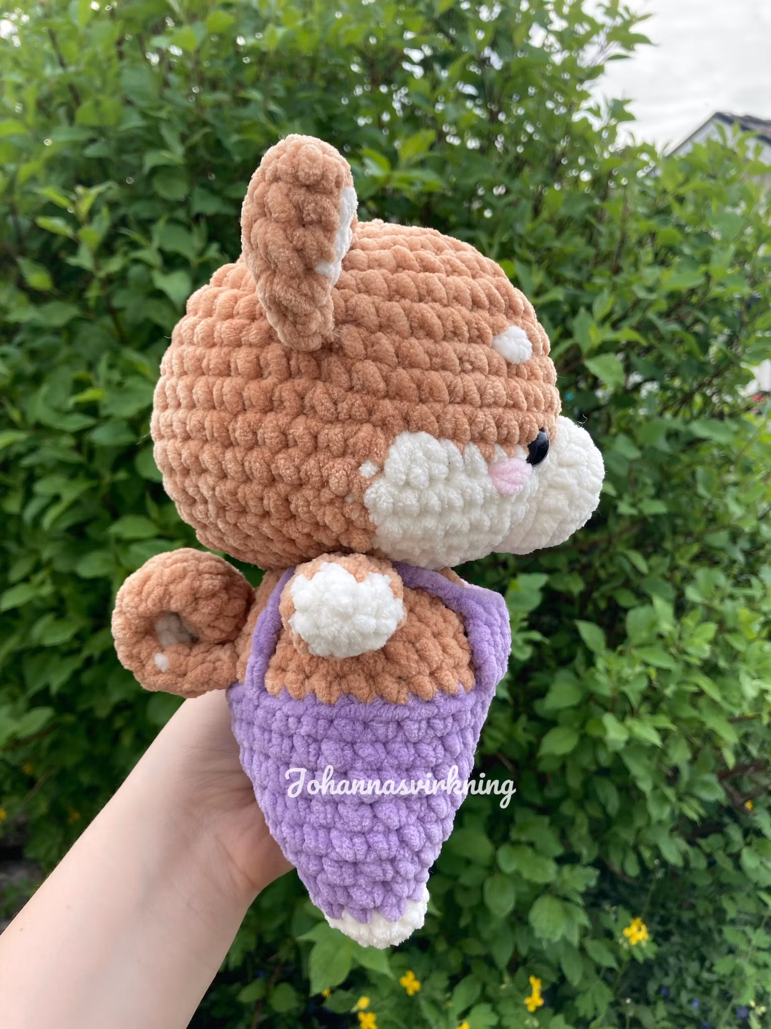 Virkad av mjukt polyester garn, stoppad med polyester stoppning och har säkerhetsögon och säkerhets nos av plast. 24 cm lång.OBS: Håll utom räckvidd av barn und