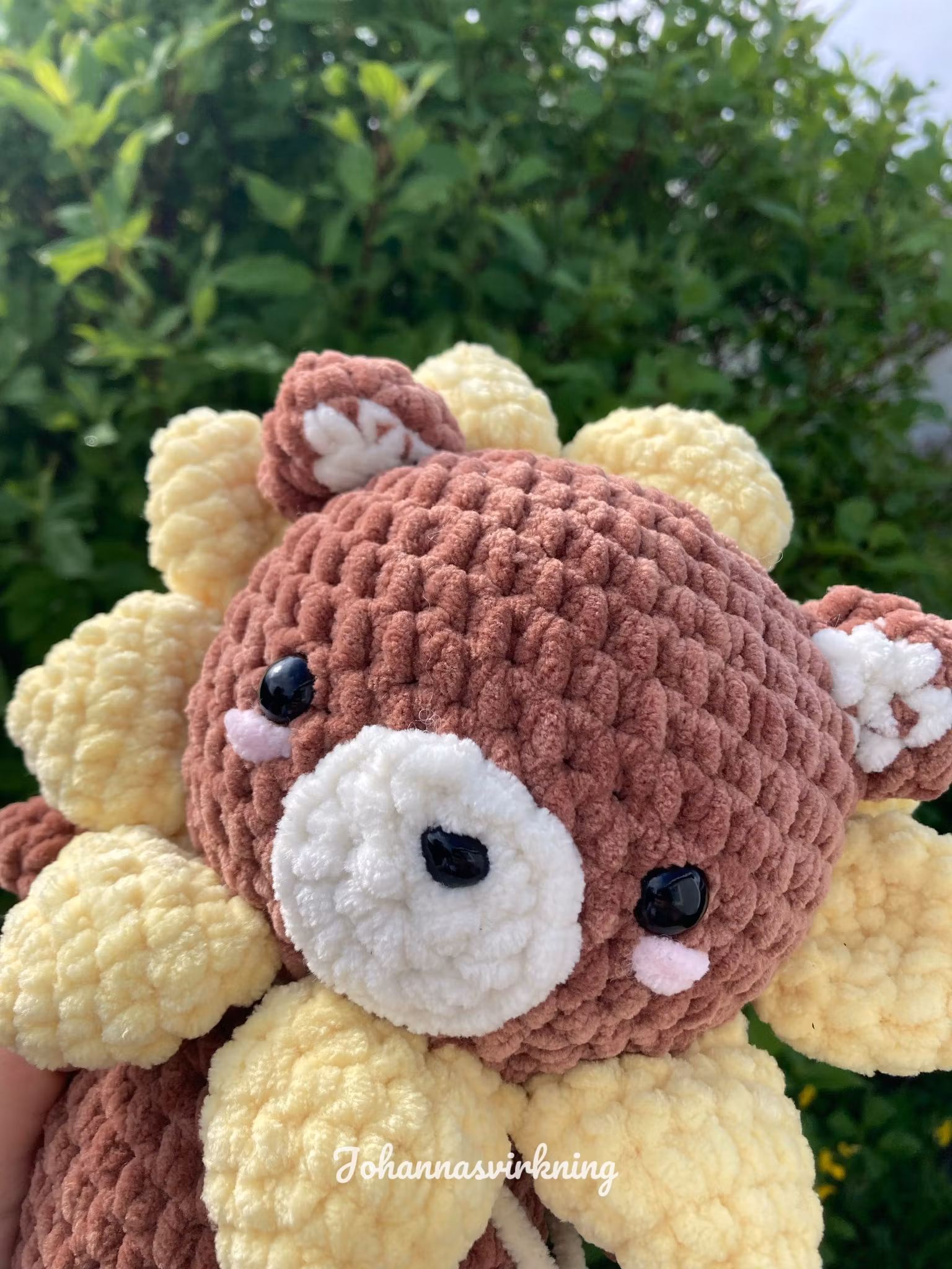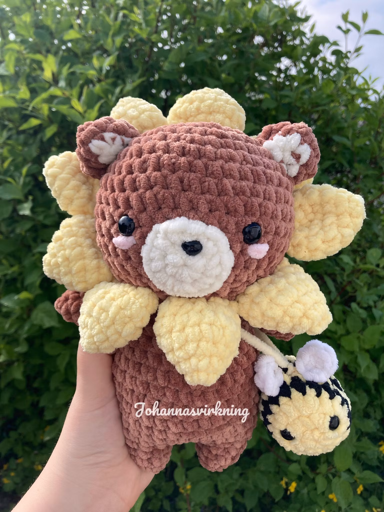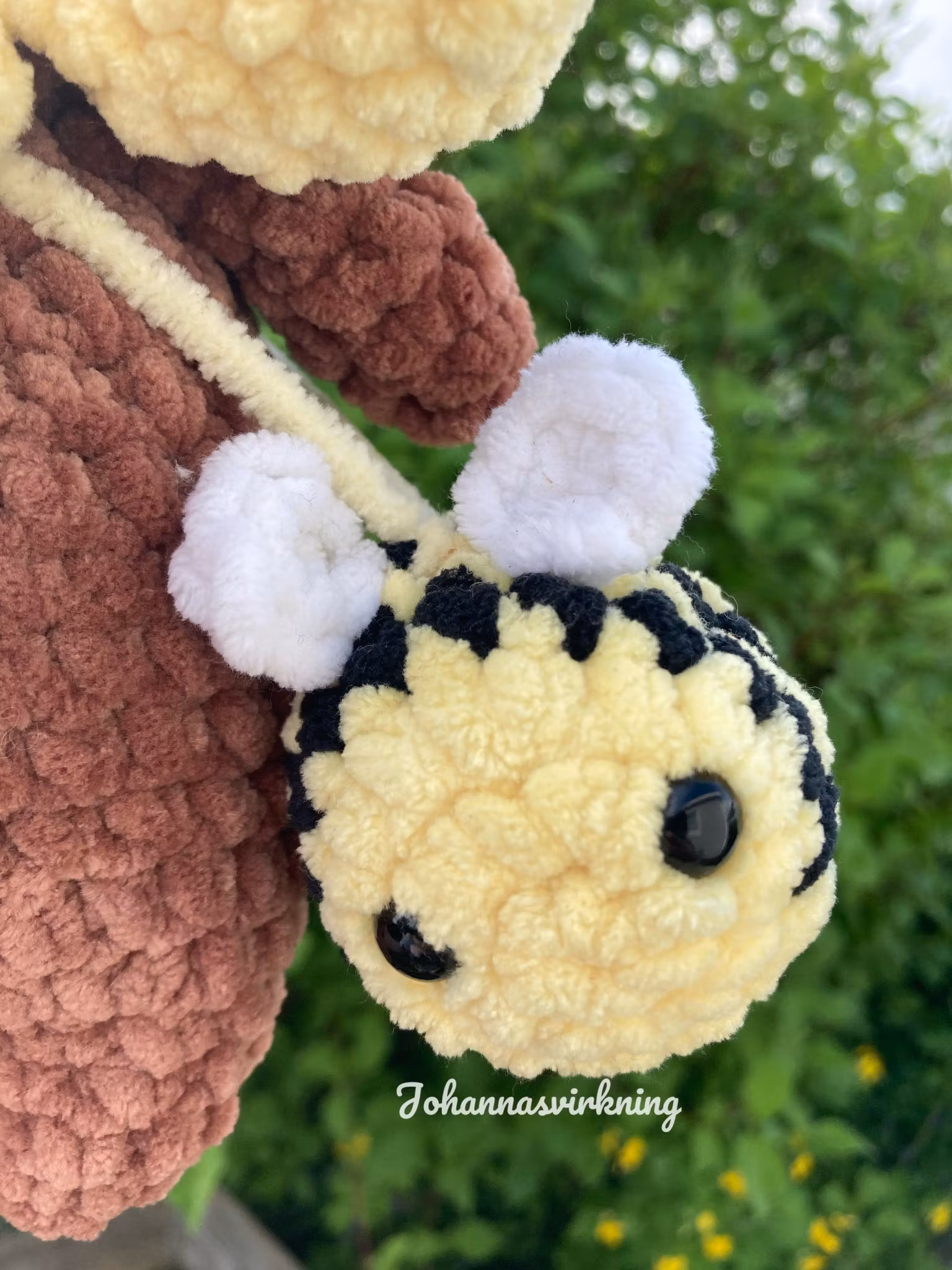 Virkad med polyester garn, stoppad med polyester, säkerhetsögon av plast. Björnen är cirka 25 cm lång. Kommer också med ett litet bi.