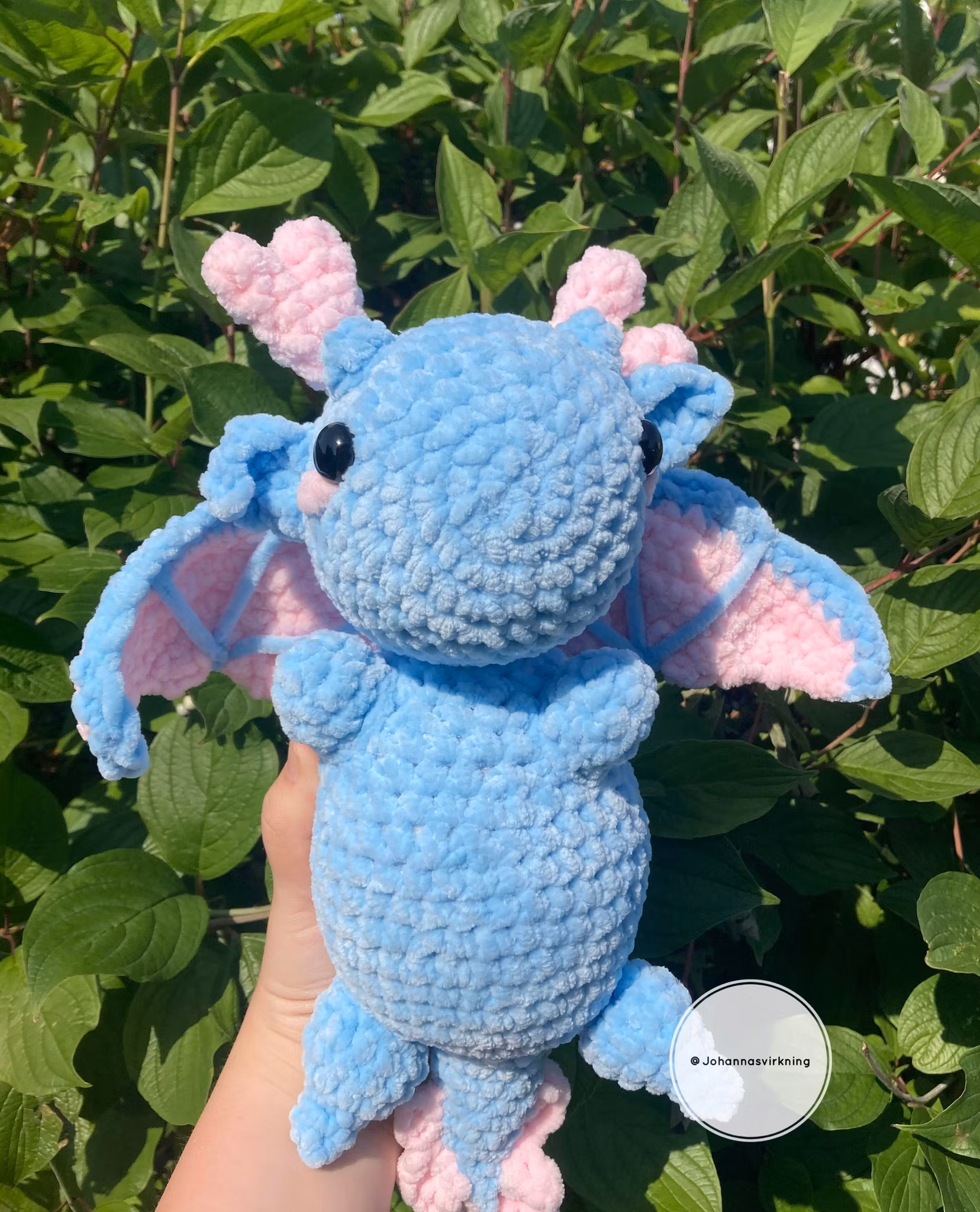 Den här ljus blåa draken är gjord av mjukt polyester garn. Den är 38 cm lång och har en vingbredd av 26 cm. Kommer med en namnlapp med ett unikt namn. OBS: Håll utom räckvidd av barn under 3 år och djur.