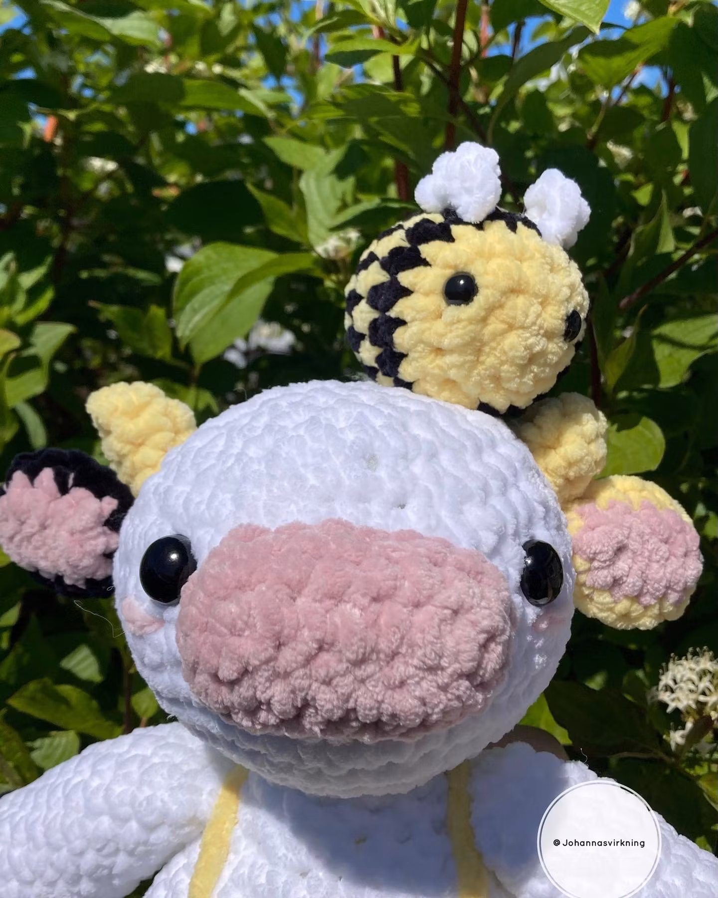 En ko med ett fastsytt bi,virkad av 100 procent polyester garn. Den är cirka 40 cm lång. Kommer med namnlapp med ett unikt namn på. OBS: Håll utom räckvidd av barn under 3 och djur.