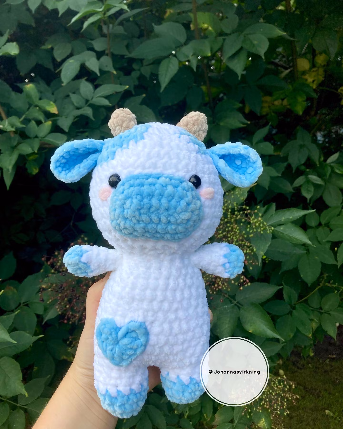 Denna ko är 26 cm lång och gjord av mjukt 100% polyester garn. Kommer också med en namnlapp med ett unikt och gulligt namn. OBS: Håll utom räckvidd av barn under 3 år och djur.