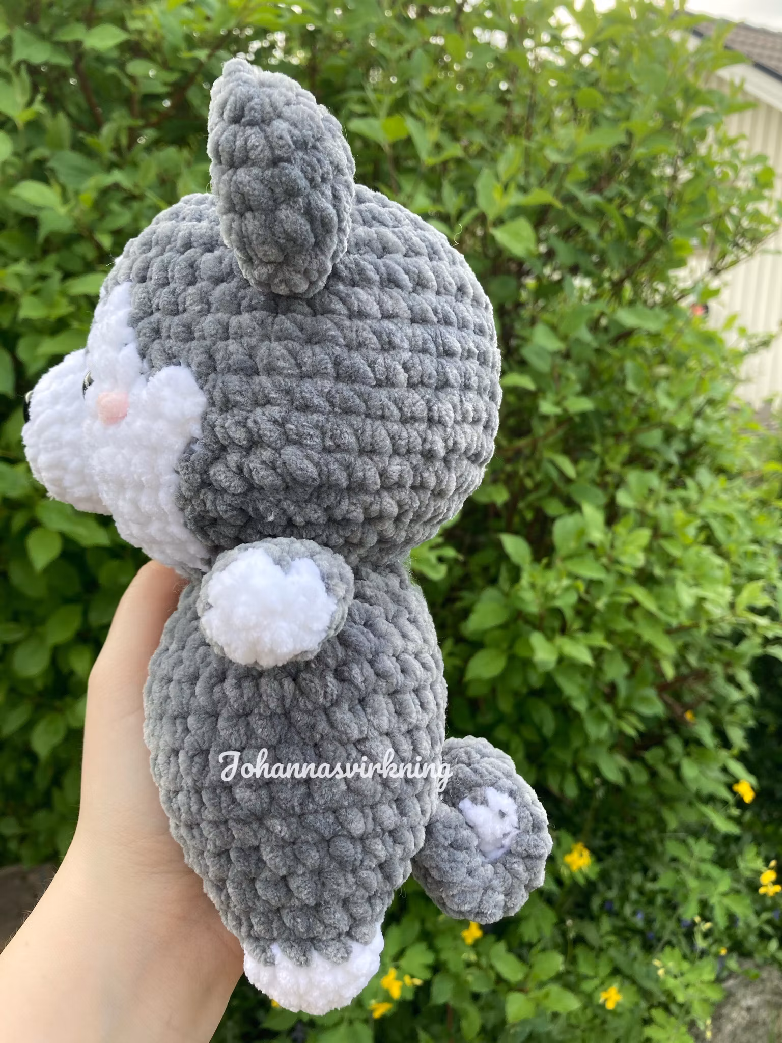 Virkad av mjukt polyester garn, stoppad med polyester stoppning och har säkerhetsögon och säkerhets nos av plast. 24 cm lång.