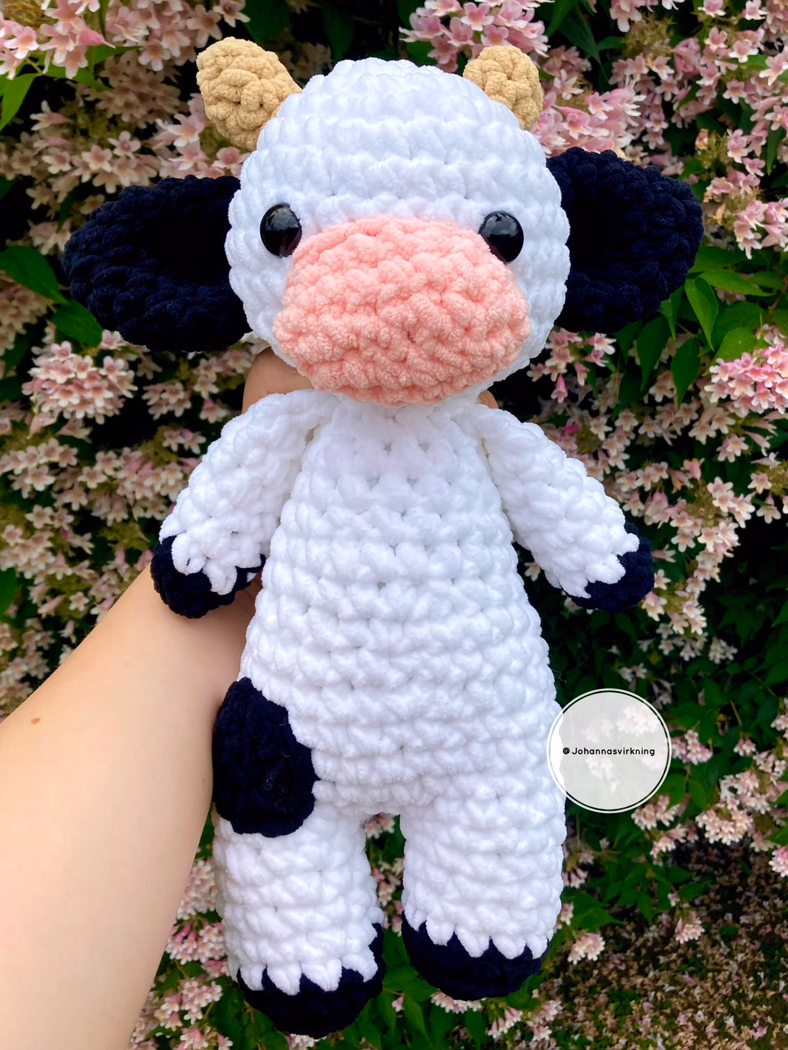 Denna ko är virkad av extra tjockt polyester garn. Den är 36 cm lång, Kommer med ett unikt namn.